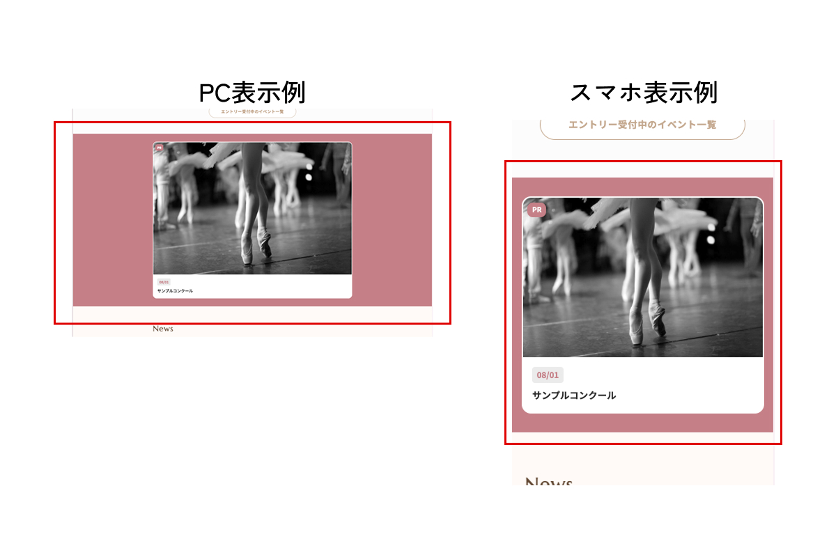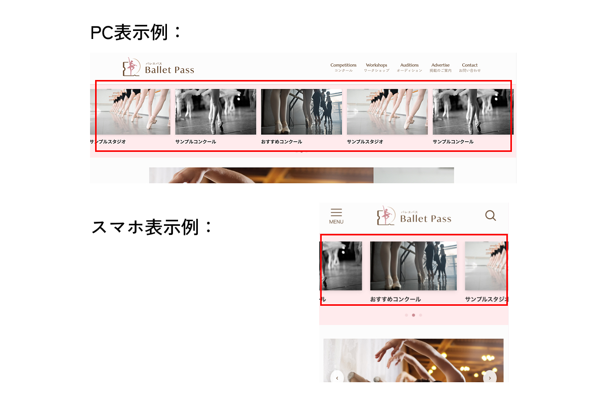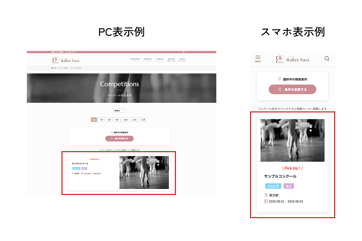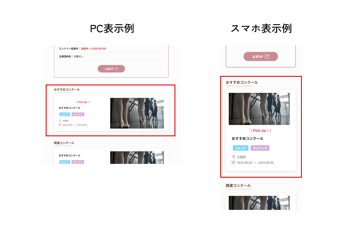 コンクール一覧・スタジオ一覧など、各ジャンルのページ内に1件のみランダム表示されるPRスペースに掲載されます。
